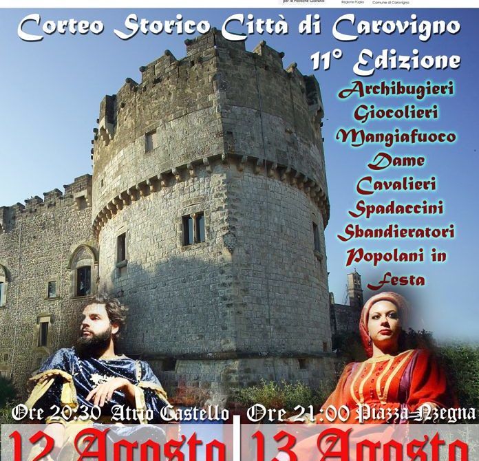 Oggi e domani, undicesima edizione dell’Invito a Corte Corteo Storico Città di Carovigno nella città addobbata con i vessilli e le insegne del tempo. La rievocazione storica mette in scena l’anno domini 1386 con tutto l’universo umano che ruotava intorno alle poderosa mura del castello. L’arrivo nelle terre di Carbinia dei regnanti, Raimondo Del Balzo Orsini e Maria D’Enghien, il saluto delle contrade e la festa in loro onore. I residenti delle terre vicine, dame, cavalieri, spadaccini, giullari, armigeri e popolani renderanno omaggio portando in dono il frutto del loro lavoro. Si comincia oggi alle 19.30 con la lettura del Bando di invito a corte nel Castello, nel borgo antico ed in piazza. Poi, via ai festeggiamenti con la cena dei regnanti che si collega alla cena medioevale aperta al pubblico nell’atrio del castello. Domani, alle 19.30, accampamenti e postazioni medievali in piazza. Alle 21 dal castello partirà il grande corteo storico che dalle vie del centro storico raggiungerà piazza Nzegna con la cerimonia della consegna dei doni, il saluto delle contrade e la festa del borgo antico con Sbandieratori, artisti di strada, spadaccini, balli medievali e popolani in festa.