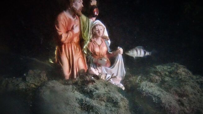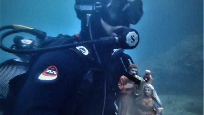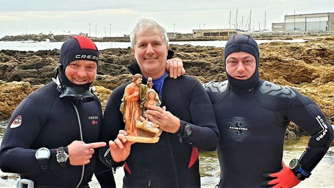 Antonello Quitadamo, Piepaolo Cito ed Alessandro Caiulo, supportati dall’esterno da Fabio Nico, si sono immersi da una caletta in cui il mare era più calmo, sul litorale nord di Brindisi e, pinneggiando in processione, hanno riposto la Natività in una grotticella sottomarina a circa dieci metri di profondità.
