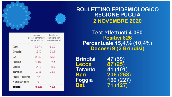 Oggi lunedì 2 novembre 2020 in Puglia, sono stati effettuati 4.060 test per l’infezione da Covid-19 coronavirus e sono stati registrati 626 casi positivi (15,4% contro il 10,4% di ieri): 206 in provincia di Bari, 71 in provincia BAT, 47 in provincia di Brindisi, 169 in provincia di Foggia, 87 in provincia di Lecce, 41 in provincia di Taranto, 5 casi di residenti fuori regione.