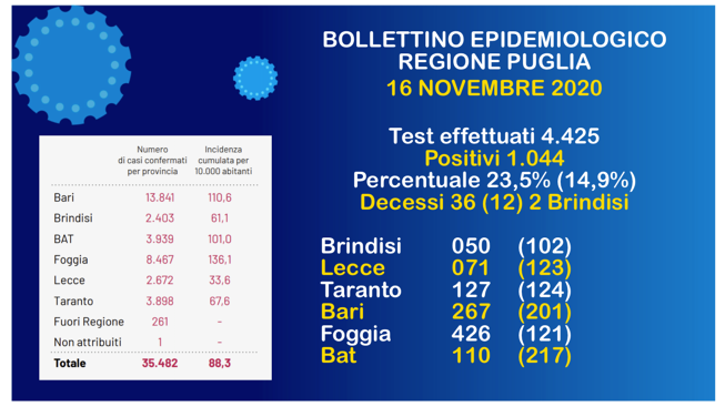 Oggi lunedì 16 novembre 2020 in Puglia, sono stati registrati 4.425 test per l’infezione da Covid-19 coronavirus e sono stati registrati 1.044 casi positivi (record di rapporto positivi/tamponi 23,5% contro il 14,9% di ieri): 267 in provincia di Bari, 50 in provincia di Brindisi, 110 nella provincia BAT, 426 in provincia di Foggia, 71 in provincia di Lecce, 127 in provincia di Taranto, 3 residenti fuori regione. 10 casi di provincia di residenza non nota sono stati riclassificati e riattribuiti.