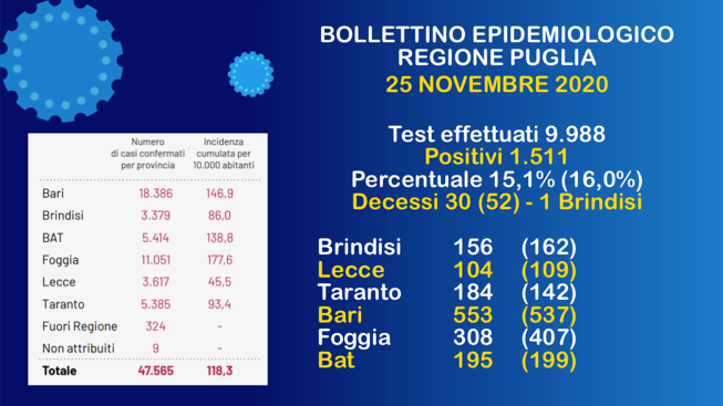 Oggi mercoledì 25 novembre 2020 in Puglia, sono stati registrati 9.988 test per l’infezione da Covid-19 coronavirus e sono stati registrati 1.511 casi positivi: 553 in provincia di Bari, 156 in provincia di Brindisi, 195 nella provincia BAT,308 in provincia di Foggia, 104 in provincia di Lecce, 184 in provincia di Taranto, 8 residenti fuori regione, 3 casi di residenza non nota.