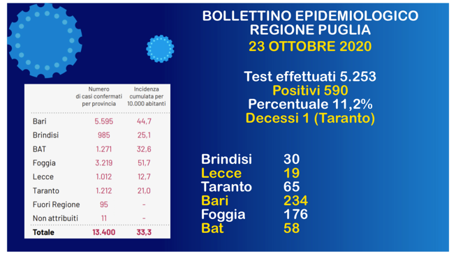 Covid, 23 ottobre: 30 positivi nel Brindisino. In Puglia la percentuale sale all’11,2%