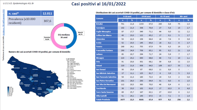 Per quanto riguarda la distribuzione per Comune i positivi sono 3.212 a Brindisi, 1.164 a Francavilla Fontana, 1.112 a Fasano, 1.020 a Ostuni, 919 a Mesagne, 547 a San Vito dei Normanni, 491 a Ceglie Messapica, 480 a Carovigno, 442 a Oria, 410 a Latiano, 388 a San Pietro Vernotico, 269 a Torre Santa Susanna, 253 a San Pancrazio Salentino, 238 a Cisternino, 221 a Erchie, 212 a Villa Castelli, 187 a Cellino San Marco, 165 a Torchiarolo, 153 a San Michele Salentino, 128 a San Donaci. I Comuni della provincia di Brindisi con i maggiori valori di incidenza cumulativa sono, nell’ordine, Brindisi, Torchiarolo, Francavilla Fontana, Torre Santa Susanna.