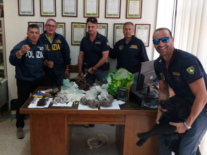 All’interno dello sgabuzzino di Guzzo i poliziotti hanno rinvenuto altri cinque panetti di hasciscc (peso complessivo oltre mezzo chilogrammo), cinque involucri di cellophane contenenti complessivamente quasi mezzo chilo di marijuana, oltre a 41 dosi della stessa sostanza già confezionate in bustine di cellophane; sette piccole dosi di “pupieddi”, confezionati con cellophane di colore bianco e chiusi all’estremità con del nastro adesivo isolante – contenenti cocaina mischiata all’anfetamina, per un peso complessivo di circa 4,3 grammi; della stessa miscela è stato recuperato un altro e più grande involucro il cui peso era di circa 7,5 grammi. Oltre alla droga, materiale per il taglio della sostanza stupefacente e il confezionamento delle dosi.