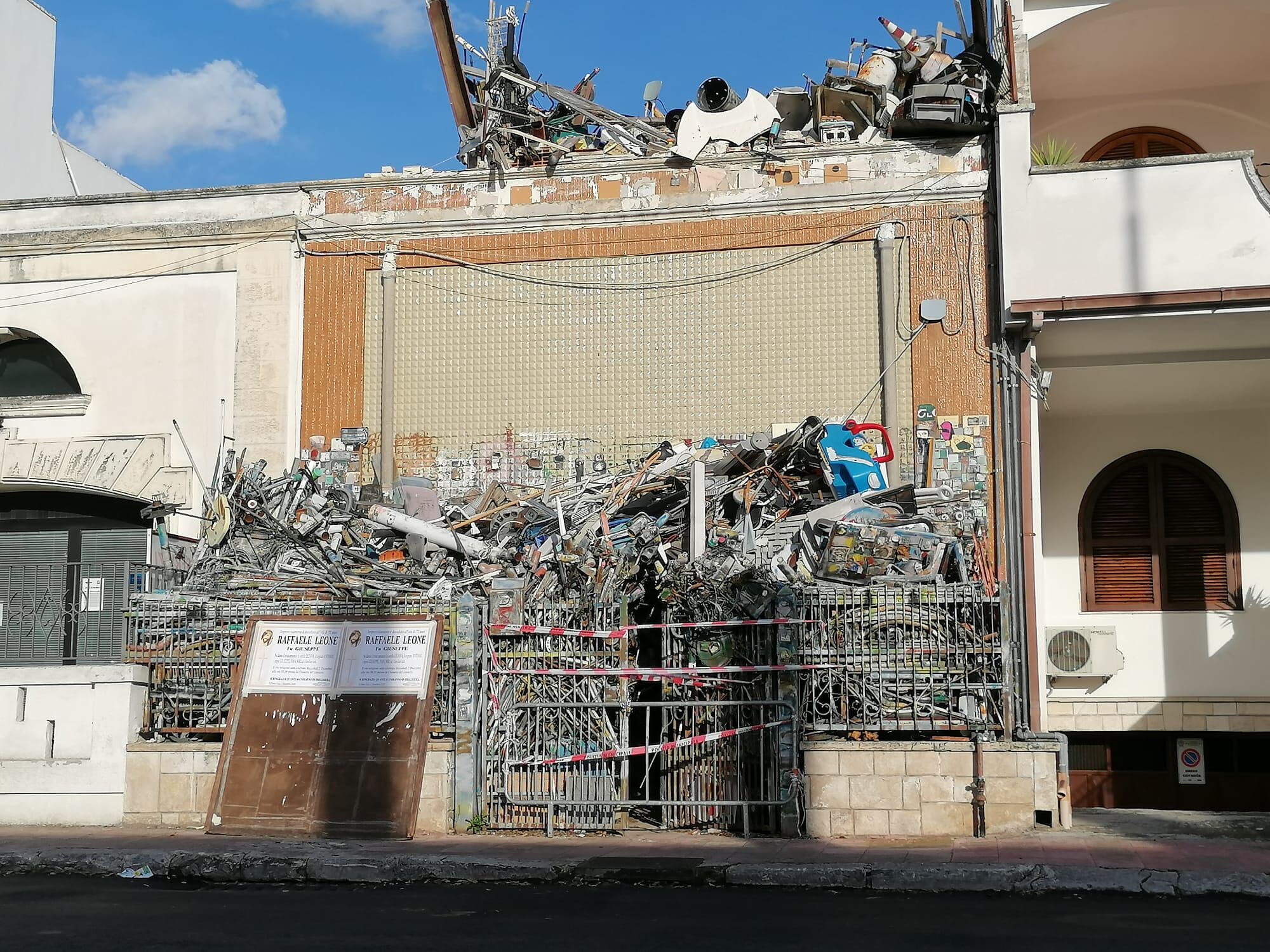 In via Lecce, la stessa strada dell’ospedale Ninetto Melli, c’è sempre un via vai di gente. Auto, pedoni e gatti, moltissimi gatti. Le persone passano indifferenti, non si voltano neppure più. Ormai quell’incredibile museo del ferrovecchio, una catasta di tubi, aste, confezioni in latta, pinne, tastiere e calcolatrici, passa inosservato nonostante sia davvero singolare, qualcosa di unico, una specie di santuario della Pop-art (tanto per dirne una, da profani) che, se si trovasse a Bruxelles o nei sobborghi londinesi, probabilmente accoglierebbe migliaia di visitatori. Paganti.