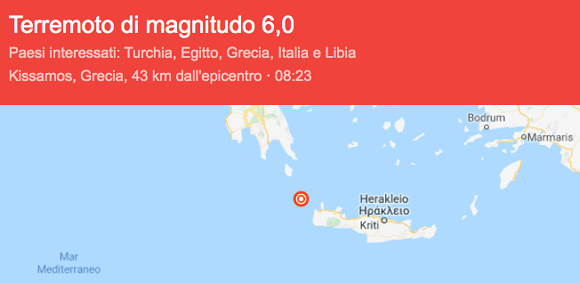 Nuova scossa di terremoto: alle 8.23 la terra ha tremato questa volta nell’isola di Creta. Il sisma è stato di intensità 6.0 ed è stato distintamente avvertito anche in provincia di Brindisi.