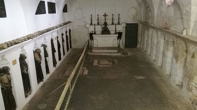 Da una delle botole presenti sul pavimento, si scendeva per accedere tra i cunicoli, agli angusti ambienti nei quali si provvedeva alla operazione di eviscerazione del corpo e il conseguente processo di mummificazione che durava diversi mesi. Le 11 mummie attualmente visibili sono databili tra il 1781 ed il 1856, ovvero ben oltre l’editto napoleonico del 1806 che vietava la sepoltura nei luoghi sacri e le consentiva solo nei cimiteri posti fuori le mura cittadine. Questo elemento fortifica la convinzione per cui l’arciconfraternita della morte di Oria vivesse con grande unicità l’indipendenza dallo Stato e dalla Chiesa.