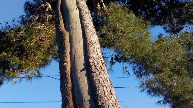 “Per la realizzazione di questa area verde, negli anni’60 furono piantumate piante di eucalipto, Pino d’Aleppo e Pino domestico (per intenderci, quella specie che produce pinoli commestibili). La vegetazione è oggi fortemente degradata, con la scomparsa di tanti esemplari di pino, probabilmente colpiti da patologie e sicuramente devastati, come altre piante, da incendi dolosi (che non mancano mai). Oltre a ciò si aggiungono anche tracce di fulmini, testimoniate da una grande e sorprendente cicatrice che attraversa per tutta la sua altezza il tronco di un pino. Colpita da una saetta, questa straordinaria pianta ha prodotto nuovi tessuti vegetali legnosi, riuscendo così a guarire dalla profonda lesione provocata dalla saetta, chissà quanto tempo fa.