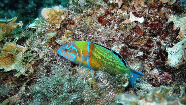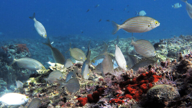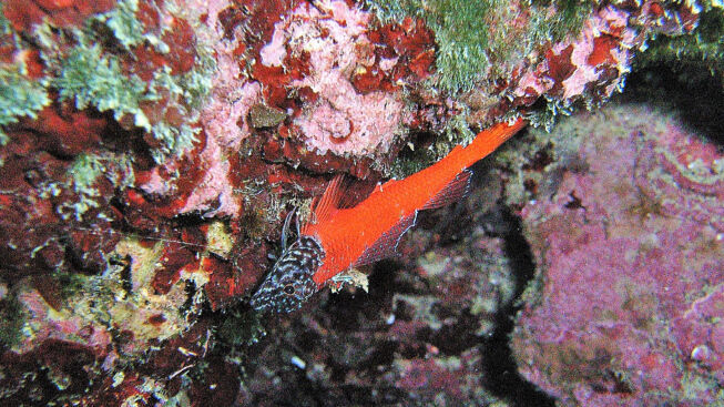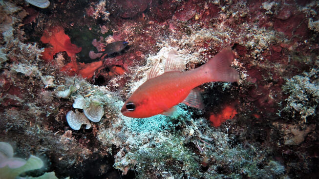 Dove il mare cominciava ad essere più profondo, 10-12 metri al massimo in questa zona, qualche Apogon, di uno sgargiante colore rosso per cui è conosciuto anche come pesce cardinale, si è mostrato per qualche secondo, prima di mettersi al rifugio nelle fessure della roccia.