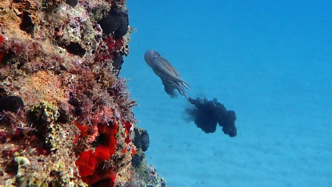 Sulla via del ritorno uno scattante Polpo appena incrocia il mio sguardo e, a cautela, spruzza un po’ di nero inchiostro prima di accendere le turbine ed allontanarsi come un razzo, ma non abbastanza velocemente per sfuggire allo scatto della mia fotocamera scafandrata.