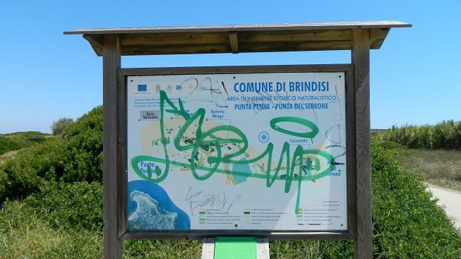 Proprio all’ingresso del parco un brutto biglietto da visita per la città, costituito dal cartellone informativo deturpato di vernice verde da un qualche stupido ed incivile writer, neanche tanto abile ad armeggiare con la bomboletta spray.