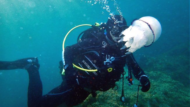 Dopo un’altra mezzoretta di girovagare, siamo costretti, a malincuore, a tornare verso la spiaggia pinneggiando con la parete rocciosa alla nostra sinistra e, per non rischiare di rimanere senza aria, evitiamo ulteriori tappe esplorative fino a quando la distesa di ricci e la poca profondità del fondale ci fa comprendere che eravamo ormai giunti in prossimità della spiaggia; nel frattempo incontriamo un “Polmone di mare” la più bella ed inoffensiva medusa del Mediterraneo, attirata dalla corrente calda sottocosta, resa simile ad una luminosa abatjour dal taglio della luce solare che, penetrando in mare, la colpiva.