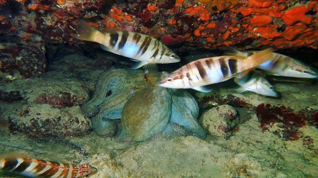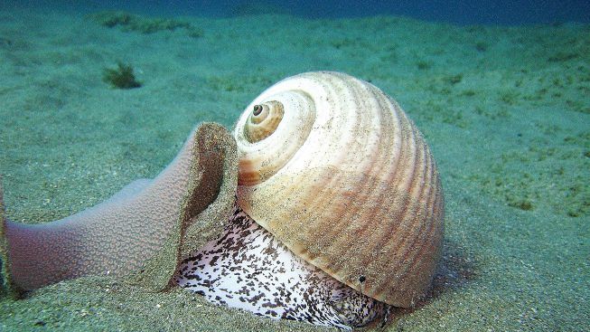 Essendo trascorsa circa mezz’ora dalla nostra discesa in acqua ed avendo ancora sufficiente aria, ci concediamo un bel giretto fra i corridoi e canyon sottomarini creatisi fa i grossi massi di roccia e tocchiamo nuovamente il fondo a -15 metri: sulla sabbia c’è un bell’esemplare di Tonna Galea, la più grossa conchiglia esistente nelle nostre zone, nell’atto di depositare le uova, ispezionando i tagli di roccia troviamo una bella tana di Corvine e, poco più avanti, in un altro anfratto, la strana coabitazione fra un polpo di discrete dimensioni ed una dozzina di vivaci Perchie, mentre un grosso Scorfano, appena infastidito dal nostro passaggio, fa quasi da sentinella.