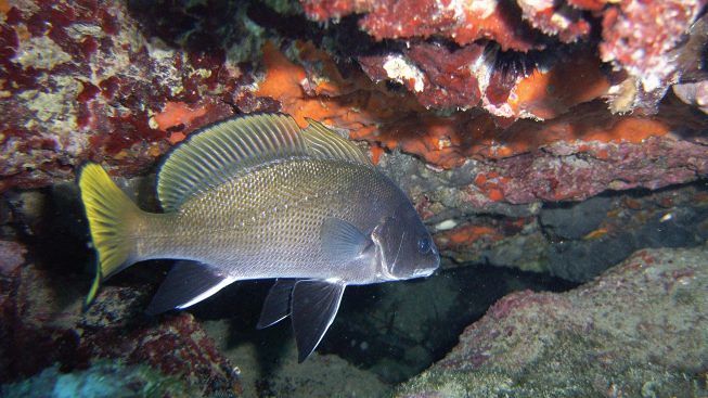 Ogni specie di pesce presente nell’Adriatico meridionale ha una sua nutrita rappresentanza a Punta Penne: banchi di Salpe che brucano la vegetazione superficiale che incrosta gli scogli e la cui taglia, come anche succede per gli altri pesci, aumenta man mano che si scende più giù, nuvolette di nere Rondinelle di mare, insieme a coloratissimi Cazzi di Re, che ci nuotano attorno, giovani Saraghi ed Occhiate, allegramente in giro, mentre quelli di taglia più grossa preferiscono non allontanarsi troppo dai tagli nella roccia in cui si rintanano al nostro apparire.