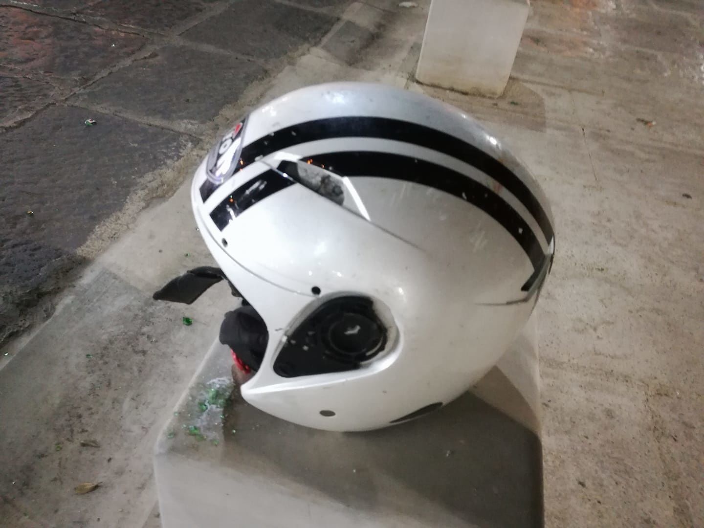 Per strada qualche bottiglia spaccata, schegge di vetro e i pezzi di un casco rotto sporco di sangue.