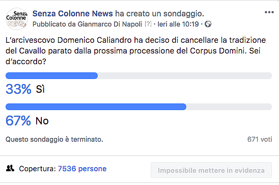 I brindisini sono contrari all’eliminazione della tradizione del Cavallo Parato, annunciata dall’arcivescovo Domenico Caliandro. O almeno questo è quanto emerge dal sondaggio lanciato ieri da Senza Colonne News sulla pagina Facebook e al quale hanno risposto 671 persone. Di queste, il 67% si sono dette contrarie all’eliminazione del cavallo dalla celebrazione del Corpus Domini e solo il 33% si è detto d’accordo.