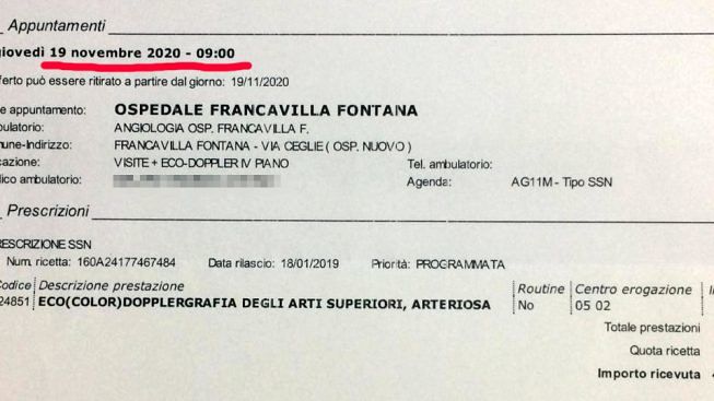 Così funziona la sanità in Puglia e in questo caso a Brindisi: una donna di 68 anni si è recata presso il Centro unico di Prenotazione della Asl di Brindisi per un’eco(color)dopplergrafia degli arti superiori, arteriosa e si è vista fissare l’appuntamento per il 19 novembre 2020, ossia tra un anno e dieci mesi, presso l’ospedale di Francavilla Fontana. Ovviamente l’unica alternativa per lei sarà una costosa prestazione medica presso un centro privato.