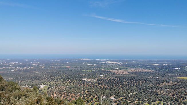 La strada provinciale n. 9 giunge ai piedi dello zoccolo murgiano e sale di 200 metri di quota in poco più di 2000 metri. Nel 1976, fu parte, cosiddetta, da montagna, del circuito dei mondiali di ciclismo che si tennero nella provincia di Brindisi, con partenza ed arrivo ad Ostuni. La rigogliosissima vegetazione è un ulteriore viaggio, nel viaggio. Al quadrivio posto alla sommità una pianta di ulivo di ben 600 anni aiuta il viaggiatore ad aumentare il senso di rispetto per una natura che qui si esalta e ti avvolge.