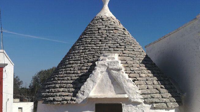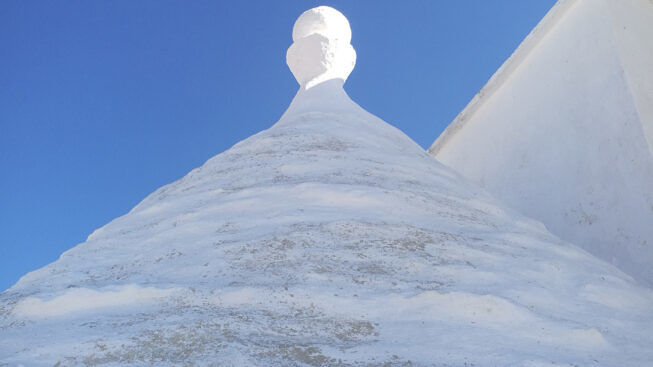 Il colore bianco delle costruzioni che spesso prendono forma di trullo, ti cambiano il punto di riferimento che si colloca in alto, in quel punto magico dell’incontro tra la punta del cono, una piccola sfera di pietra ed il cielo, quel luogo dove tutto è possibile e dove tutto s’incontra.