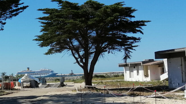L’immagine complessa di uno scatto, mi sfugge alla prima lettura, avevo inquadrato un cumulo di materiale, coperto da un grande telo bianco, non mi ero avveduto che avevo ripreso, in lontananza, il gigante del mare, la Costa Fortuna, ormeggiato alla diga di Punta Riso. Il transatlantico, come si sarebbe detto una volta, posto lì, lontano, che rende ciò che vedo di difficile comprensione. Una città tra due esempi chiari di industria e turismo, che, invece, sta languendo.