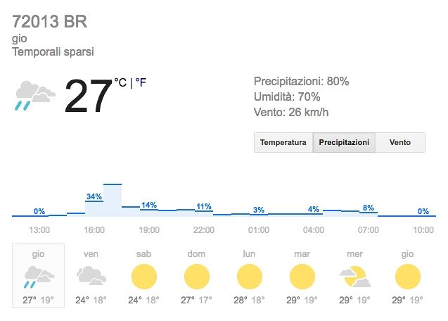 CITTA' / 11 Agosto 2016 Pioggia e grandine in arrivo in tutta la Puglia: allerta meteo della Protezione civile La sezione Protezione civile della Regione Puglia ha diramato un messaggio di allerta meteo valido sino alle o... Di Gianmarco Di Napoli