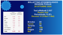 Su 3057 test per l'infezione da Covid-19 oggi in Puglia sono stati registrati 424 casi positivi (13,8% positiv...