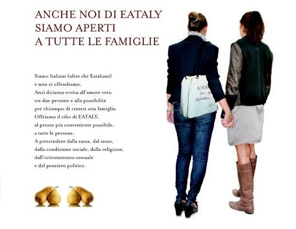 La campagna di un noto marchio svedese, mostra due uomini di spalle che si tengono per mano e lo slogan recita: “Siamo aperti a tutte le famiglie”, segue poi un’altra pubblicità del marchio Eataly con lo slogan “Aperti a tutti”; “Anche noi siamo aperti a tutte le famiglie”, questa volta la coppia è formata da due donne che si tengono per mano.