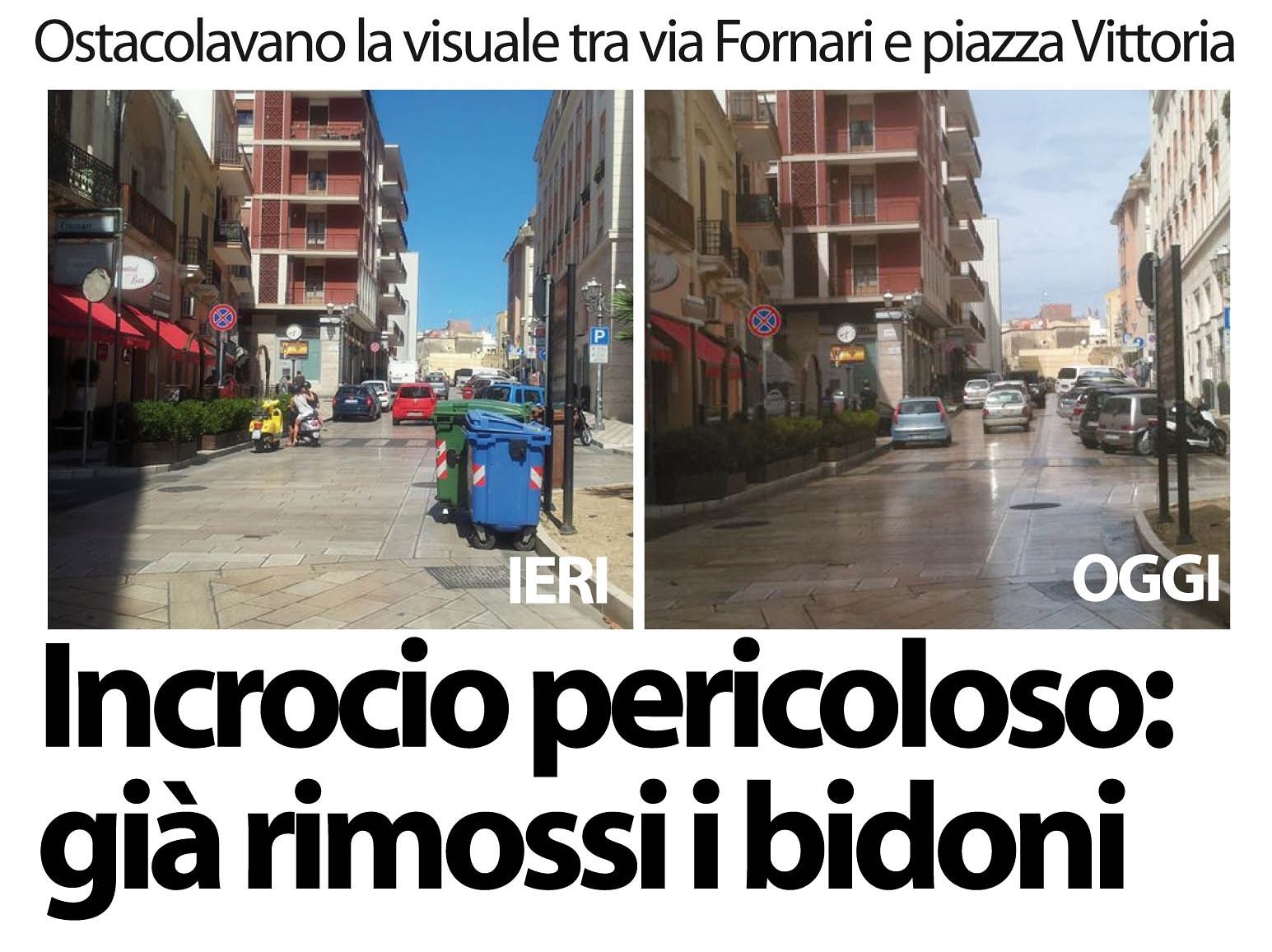 Trovata una diversa posizione ai bidoni che fino a ieri, all’altezza dell’incrocio tra via Ferrante Fornari e piazza Vittoria, come segnalato dal nostro quotidiano, ostruivano la visuale ai conducenti dei veicoli che da via Cesare Battisti si dirigevano verso via Fornari o piazza Sedile.