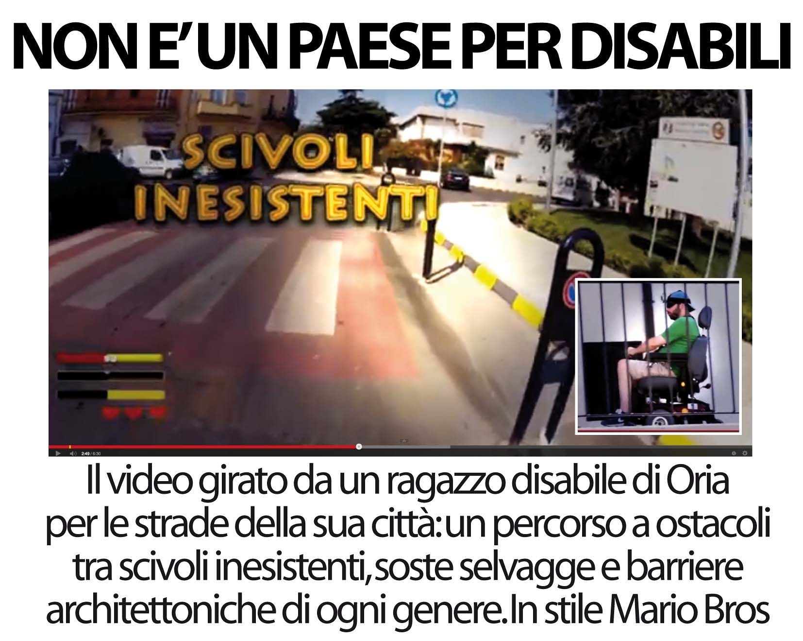 Seduto sulla sua sedia a rotelle e armato di videocamera Epifani ha documentato un piccolo tour per le vie del centro abitato di Oria, mostrandolo per quello che è: un percorso ad ostacoli. Quasi un videogioco, con tanto di sottofondo musicale in stile “Mario Bros” ed effetti speciali: ma meno divertente. Molto meno.