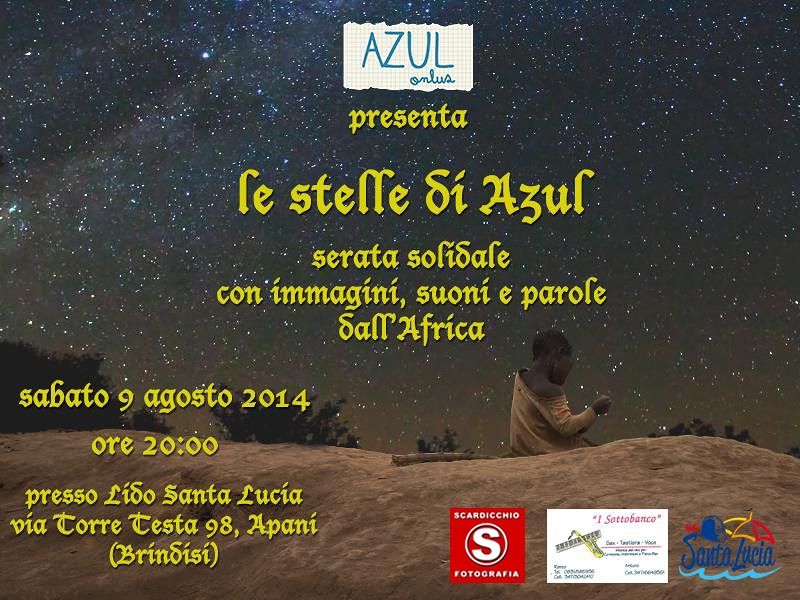 Sabato 9 agosto la spiaggia di Apani (Brindisi) si riempirà di stelle e di storie. Al Lido Santa Lucia, a partire dalle ore 20, i volontari di Azul Onlus racconteranno con immagini e parole la loro ultima missione svolta in Congo lo scorso Aprile. Da Goma a Masisi, da Bujumbura a Brazzaville, i volontari di Azul Onlus hanno attraversato i territori dell’Africa nera dove sono tutt’ora attive le guerriglie tra le milizie locali e hanno portato sostegno ai bambini in difficoltà.