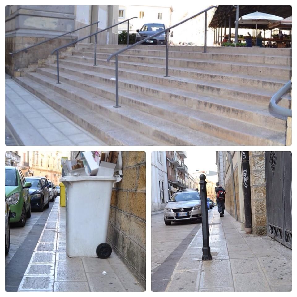 Ecco la scalinata di via Cesare Battisti rifatta per consentire il passaggio dei disabili sul marciapiedi. Ma non sembra esattamente così. L’obiettivo di Patrizio Polmone rivela che gli ostacoli per le carrozzelle non sono certo gli scalini eliminati.