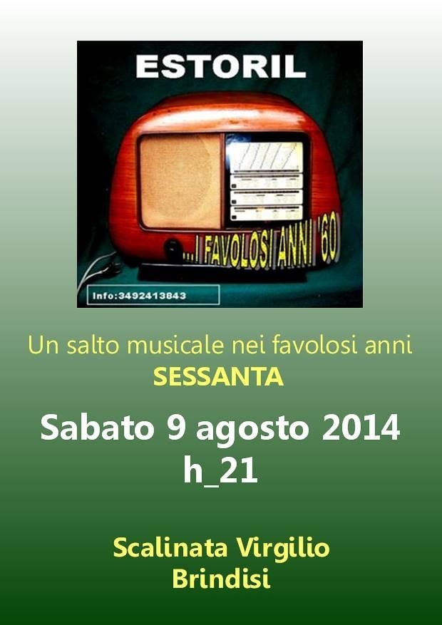 Intanto, si ricorda chestasera, sabato 9 agosto, alle ore 21,00, sulla Scalinata Virgilio, sulle tracce della memoria del celebre ristorante night bar, ‘Estoril’ restituisce l’atmosfera dei ‘Sixties’, i favolosi anni ’60. Correvano gli anni del boom economico, quelli “mitici” inventati dai giovani, i veri protagonisti del tempo con la loro voglia di cambiare il mondo, i loro ideali, i loro sogni.
