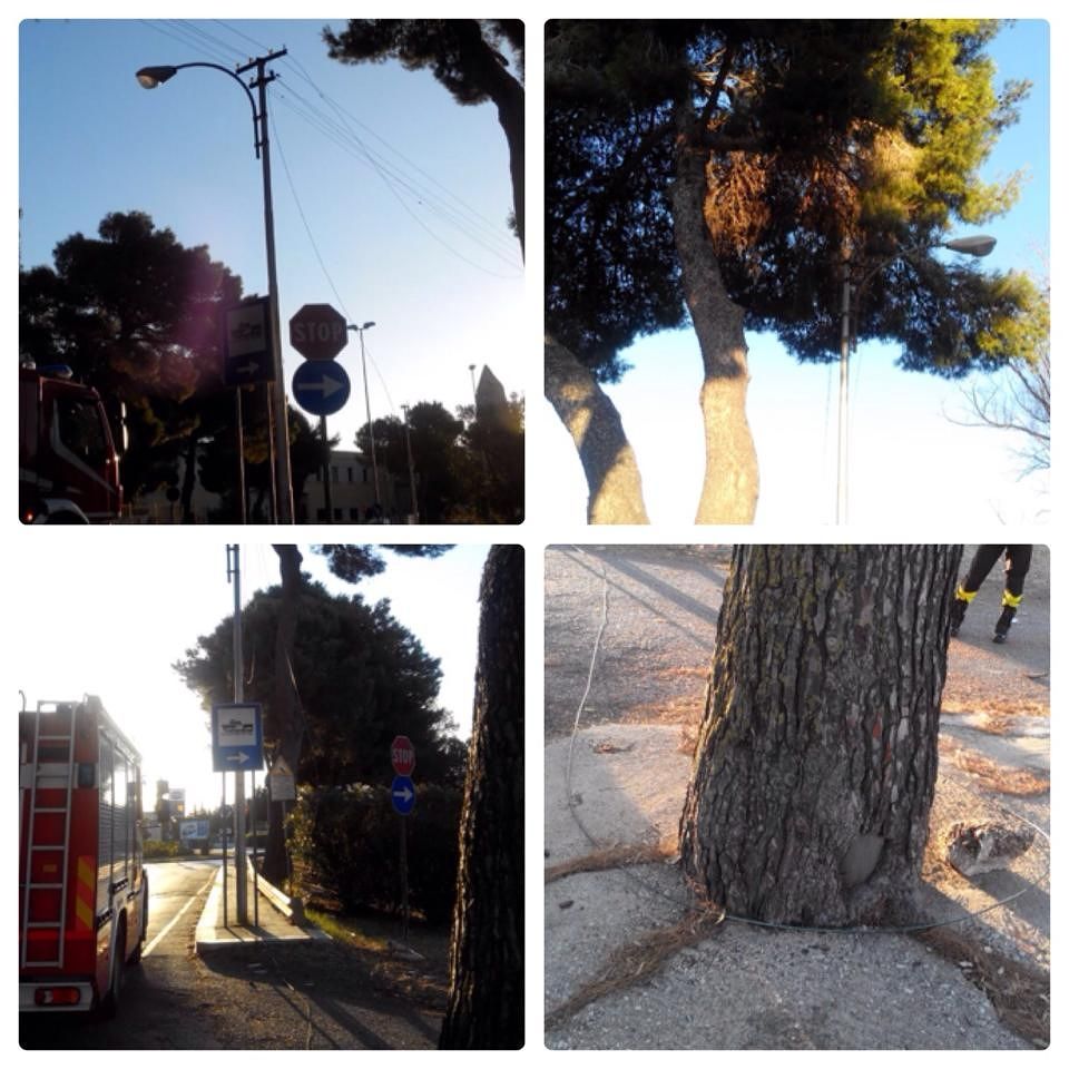 Un cavo della pubblica illuminazione penzolante e pericolosamente vicino a un albero: i vigili del fuoco di Brindisi sono impegnati in questi minuti nella messa in sicurezza dell’impianto elettrico in via Provinciale per San Vito. La situazione era di grave pericolo per i passanti.