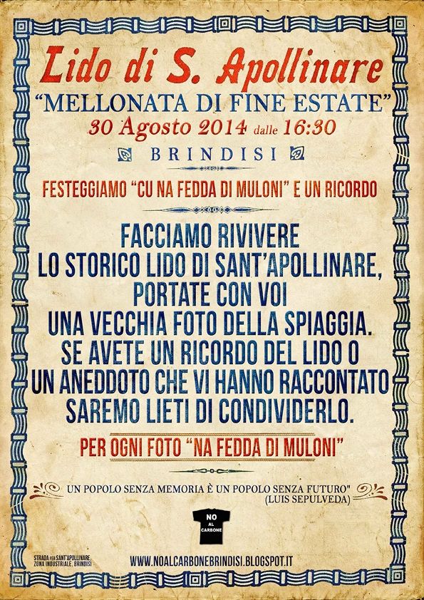 Sabato 30 Agosto dalle 16.30, si terrà la “Mellonata di fine estate”, nel luogo simbolo dell’estate brindisina: Lido Sant’Apollinare. E chi porterà con sé una vecchia foto della spiaggia sarà ripagato con una succulenta fetta di anguria fresca. I No al Carbone proseguono la loro piccola grande battaglia per ridare dignità a quella che è stata per generazioni la spiaggia simbolo dei brindisini e dopo averla ripulita centimetro per centimetro armati di rastrello e sacchietti di plastica, i Nac desiderano coinvolgere i brindisini riprendendo appunto quella che era la tradizione di fine stagione a Sant’Apollinare: la “mulunata”.