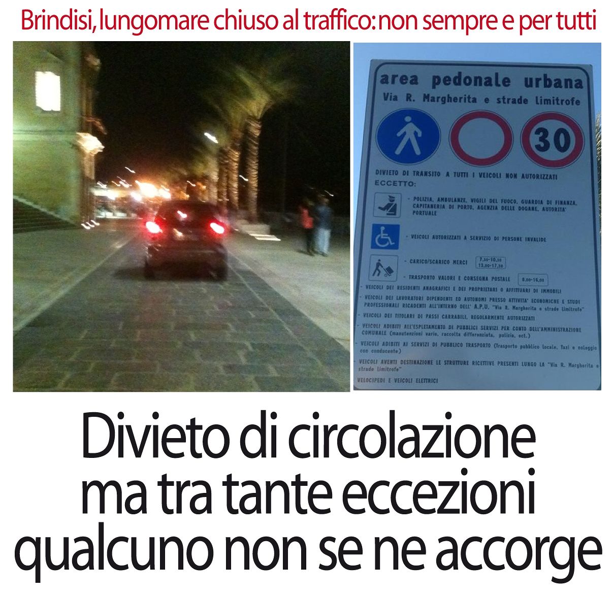 Il lungomare, adibito ad area pedonale urbana, una Ztl che permette il transito a svariate categorie, forse un po’ troppe per un’area che doveva essere il salotto buono della città, non presenta nel tratto d’entrata, all’altezza dei giardinetti di piazza Vittorio Emanuele II, nessun avvertimento o dissuasore, a parte la segnaletica decentrata.