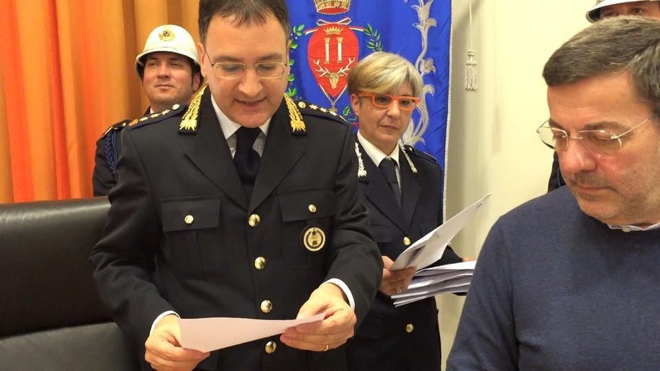 Nigro, insieme al sindaco Mimmo Consales, hanno proceduto poi alla consegna di una targa ai due vigili che vanno in pensione, Lino Capozziello e Angelo Caforio, e ai 22 che sono stati promossi maresciallo-capo: D Antonio Attanasio, Marcello Baldaro, Lorenzo Beso, Lorenzo Caiulo, Annarita Capoccelli, Elisa Capozziello, Carlo Corsa, Giovanni De Maria, Carmina Fanciullo, Rita Fusco, Vincenzo Leo, Pasquale Losavio, Carlo Manigrassi, Antonio Marrazzo, Maurizio Montanaro, Antonio Muraglia, Daniele Parisi, Pierluigi Rizzo, Francesco Romanelli, Gaetano Barbagallo, Antonio Palma e Francesco II Greco.