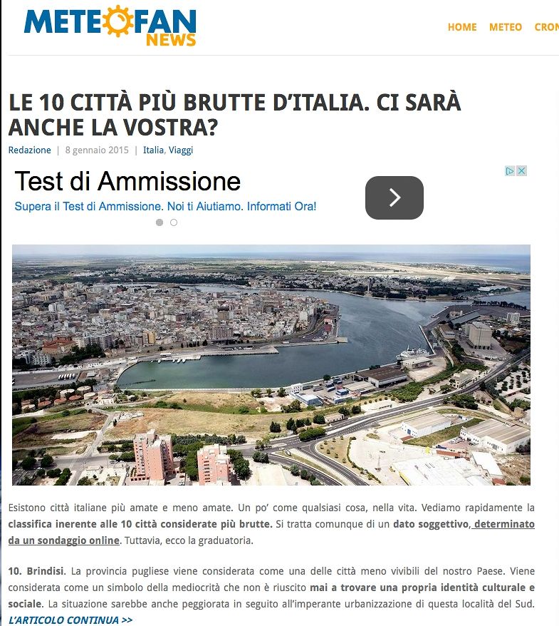 C’è un sito nazionale che si occupa di previsioni meteo che, in nome di un sondaggio le cui caratteristiche non sono note, indica Brindisi come la decima città più brutta d’Italia. Citiamo testualmente: “Esistono città italiane più amate e meno amate. Un po’ come qualsiasi cosa, nella vita. Vediamo rapidamente la classifica inerente alle 10 città considerate più brutte. Si tratta comunque di un dato soggettivo, determinato da un sondaggio online. Tuttavia, ecco la graduatoria.