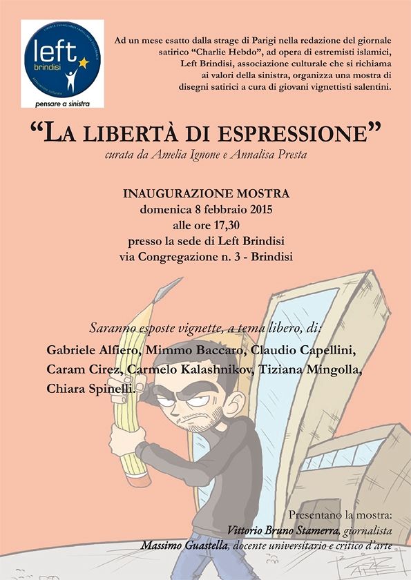 Ad un mese esatto dalla strage di Parigi nella redazione del giornale satirico “Charlie Hebdo”, ad opera di estremisti islamici, che tanta emozione ha suscitato in Europa e nel mondo, Left Brindisi, associazione culturale che si richiama ai valori della sinistra, organizza una mostra di disegni satirici a cura di giovani vignettisti salentini.