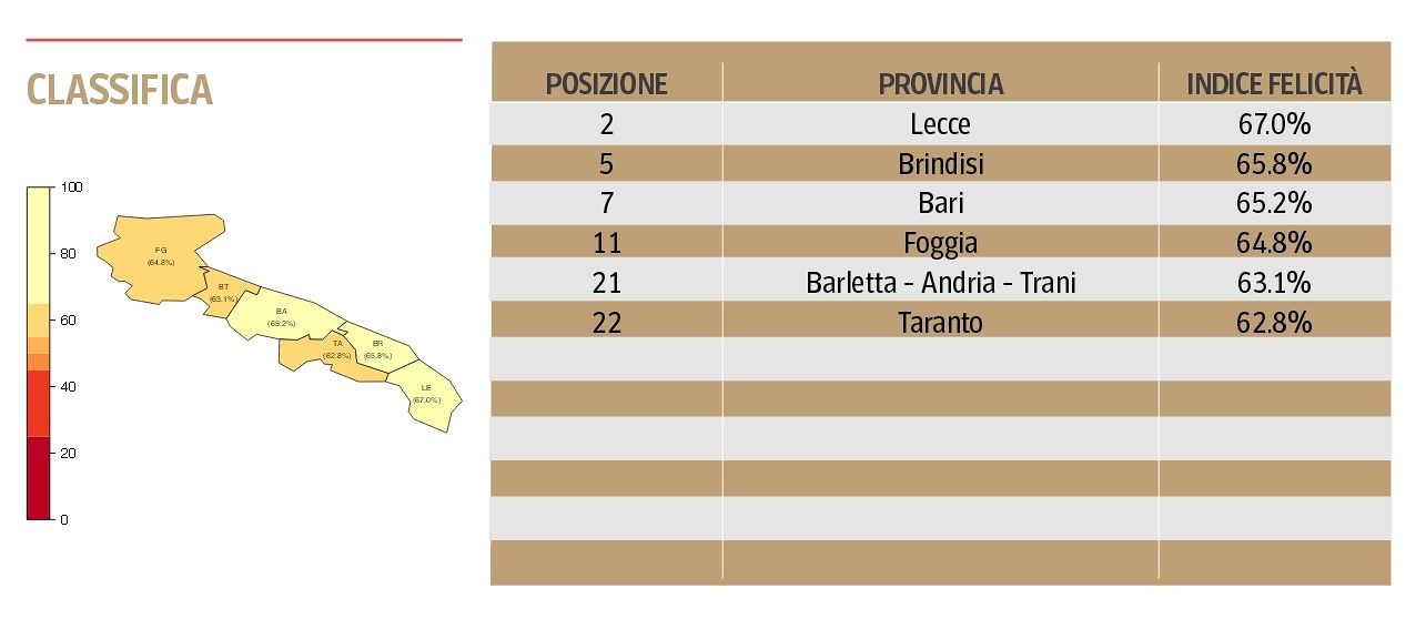 Saldato il conto con i crismi della serietà dell’argomento e la scientificità della ricerca, i cui approfondimenti rimandiamo ai più intrepidi, attraverso la lettura dell’intero rapporto, a noi cronisti basta rilevare che, fatto 58,6 il valore medio nazionale, che attesta l’Italia intorno al 50esimo posto della graduatoria mondiale della felicità, Brindisi fa registrare un indice pari a 65,8, la medesima percentuale registrata nell’anno precedente dal Cile che nel 2013, si collocava al 28esimo posto della graduatoria planetaria.