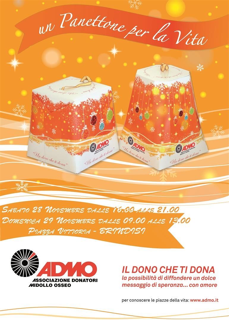 La Sezione ADMO di Brindisi organizza la Manifestazione “Un panettone per la vita”, per promuovere il valore del dono. L’obiettivo è fare breccia nel cuore delle tante persone di buone volontà, che vogliono regalare un’altra possibilità di vita a chi lotta contro leucemie, linfomi e altre patologie del sangue. Ed è per questo che sabato 28 Novembre dalle 16 alle 22 e domenica 29 novembre dalle 8 alle 13, i volontari dell’Associazione Donatori Midollo Osseo Sezione di Brindisi tornano in piazza Vittoria con l’iniziativa istituzionale “Un Panettone per la Vita”.