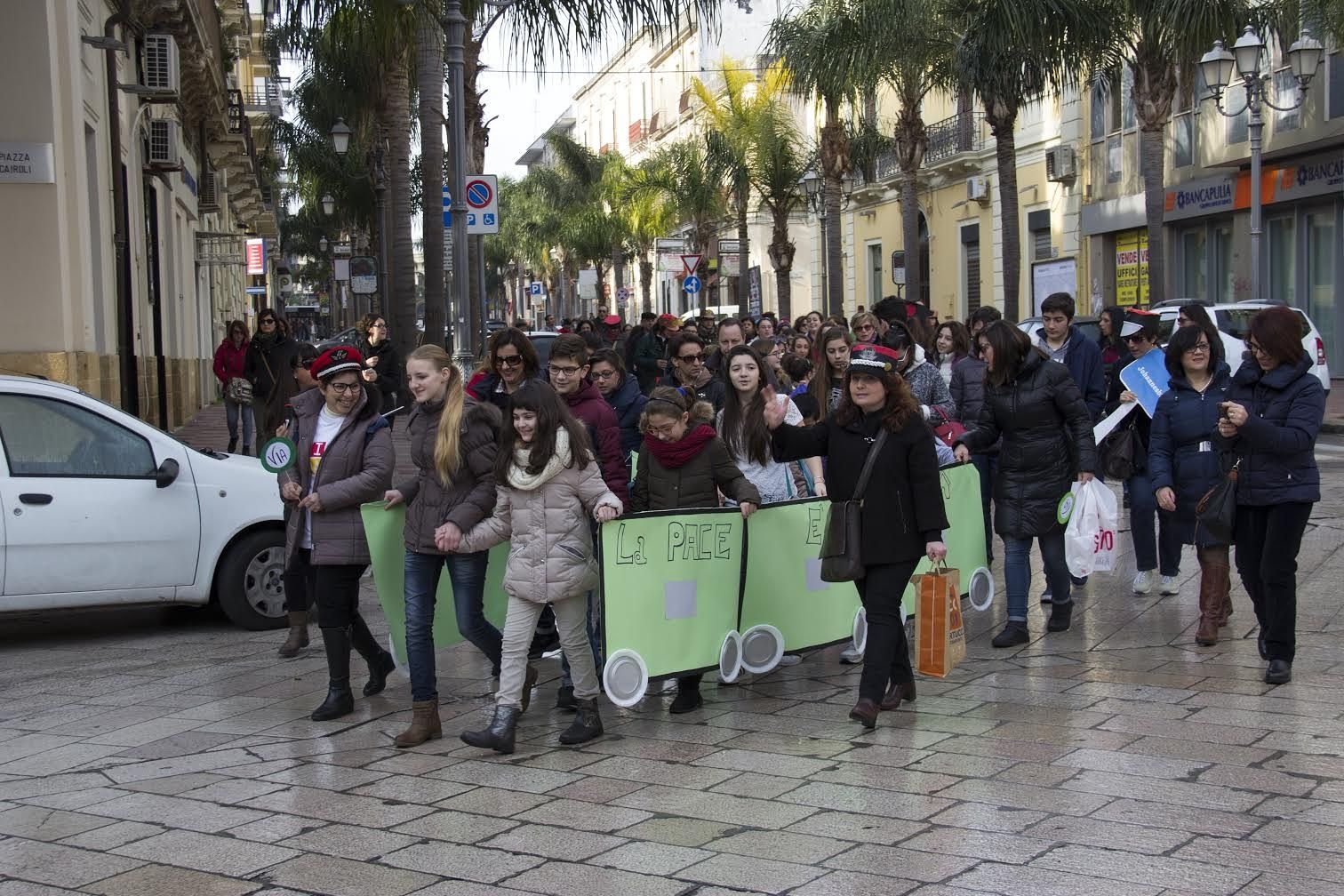 “La pace è di casa” è, infatti, lo slogan che apriva la marcia, partita dalla scuola primaria “Perasso”, dove i ragazzi, i giovani e gli adulti, attraverso alcune attività ambientate fantasiosamente sui binari e sulle fermate ferroviarie, hanno incontrato in diverse stazioni di vari Paesi del mondo dei viaggiatori stranieri in difficoltà e hanno dialogato con loro mettendosi in gioco e cercando di aiutarli. Attraverso lo svolgimento di questi giochi ed attività si è arrivati a capire che soltanto attraverso l’ascolto delle loro storie e delle loro difficoltà legate ad una lingua e ad una cultura diversa , è possibile costruire una rete di incontri, scambi e relazioni che può contribuire a realizzare un mondo di pace. La Festa ha avuto il suo epilogo nella Cattedrale di Brindisi dove i partecipanti, dopo aver marciato festosamente per le vie del centro in coloratissimi “vagoni” di cartoncino, hanno percorso una rete ferroviaria ricostruita all’esterno del Duomo, e, varcando la soglia della Porta Santa, hanno partecipato alla Celebrazione Eucaristica presieduta da don Adriano Miglietta.