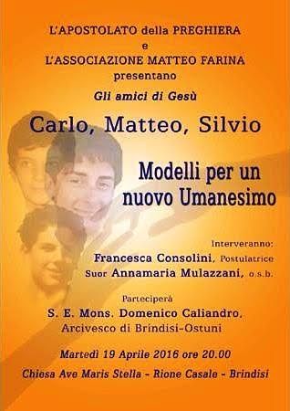 Martedì 19 aprile alle ore 20 presso la Chiesa dell’Ave Maris Stella al rione Casale in Brindisi si svolgerà l’attesissimo evento pubblico dal titolo “Carlo, Matteo, Silvio: modelli di un nuovo Umanesimo” promosso dall’Apostolato della Preghiera e dall’Associazione Matteo Farina. Nel corso della serata interverranno la dott.ssa Francesca Consolini, postulatrice delle cause di Beatificazione e Canonizzazione attualmente in corso dei tre giovani e suor Annamaria Mulazzani delle Suore Oblate Benedettine di San Vito dei Normanni. Parteciperà S.E. Mons. Domenico Caliandro, Arcivescovo di Brindisi-Ostuni.