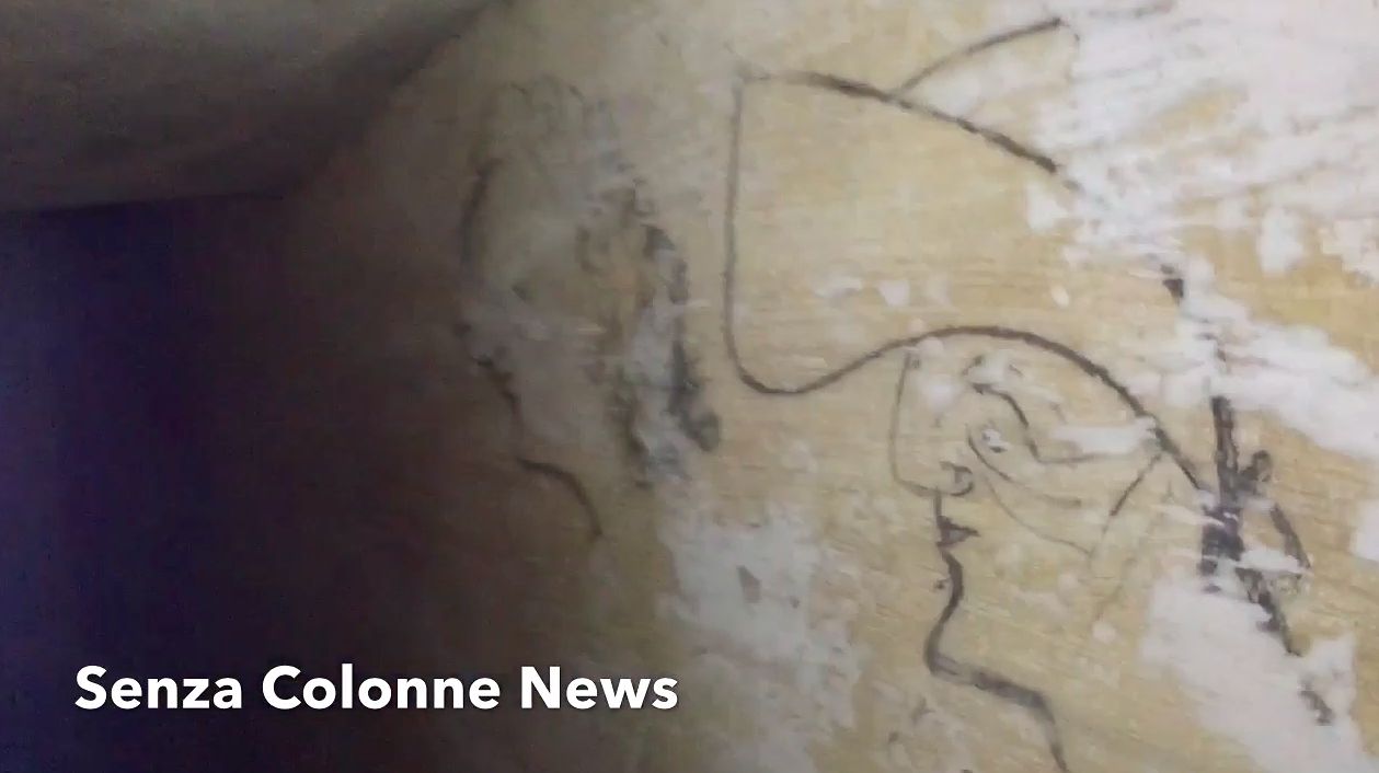 Nei cunicoli stretti che raccontano la duplice vita della scalinata (prima ristretta a incorniciare solo la colonna principale e successivamente allargata sino a contenere anche quella diroccata) vecchi disegni e tracce delle antiche mura.