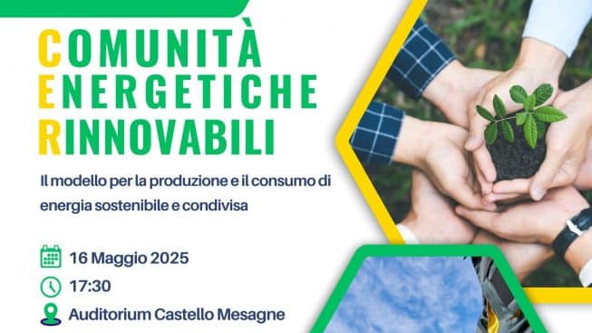 Ci saranno gli interventi di Leo Montemurro, presidente di Cerquity Sud, Savio Di Stefano, vice presidente di Cerquity e Andrea Mingolla, ingegnere, fondatore di Finanziamenti Puglia. Durante il convegno sarà spiegato quali benefici porteranno le comunità energetiche alla società, all’ambiente e all’economia e si illustrerà come potrà il modo di produrre e consumare energia e con quali agevolazioni e incentivi.