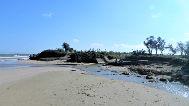 Superato il centro velico, cessa di botto la falesia ed il litorale è basso, ampio e sabbioso, di una sabbia fine e chiara che più chiara non si può.