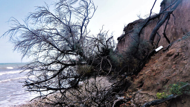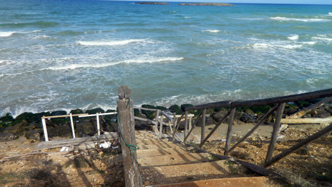 Giunto al termine della strada non posso fare altro che constatare che le scale in legno sono assolutamente inutilizzabili sia perché sgarrupate per azione del vento e dei marosi, sia perché conducono verso il nulla, dal momento che negli ultimi cinque anni il mare si è divorato anche quell’ultima linea di spiaggia che era ai piedi della falesia, mentre le opere di consolidamento e messa in sicurezza della stessa, in questo, come negli altri tratti della litoranea nord sono sati un vero flop anche se, probabilmente, a sentire sia gente esperta che un paio di abitanti del luogo, non sono mai stati posti a compimento per come erano stati progettati e, anzi, essendosi all’epoca addirittura estirpati dei vecchi tamerici, che con le loro radici tenevano insieme il terreno argilloso, e non essendo state queste essenze arboree sostituite, la situazione è ulteriormente ed in tutti i sensi, precipitata.