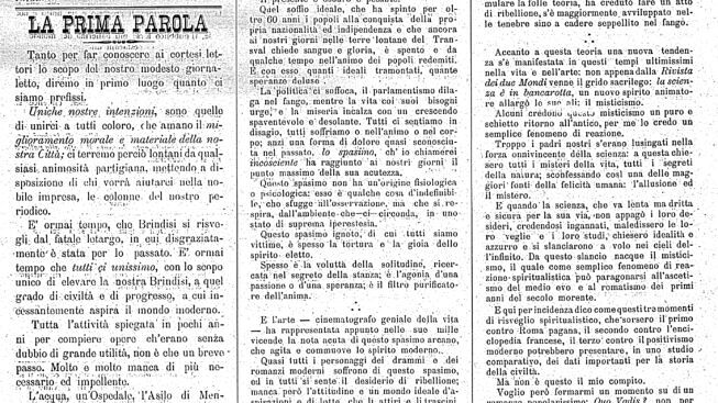 Il 18 gennaio prendeva vita il nuovo settimanale locale “La Citta di Brindisi”, quattro pagine dirette da Camillo Mealli, stampate presso lo “Stabilimento Tipografico Domenico Mealli”, sito all’angolo tra Corso Garibaldi e via Sacramento, dove aveva sede anche la direzione del giornale con uscita nella giornata del giovedì. Il costo di ogni numero era di 5 centesimi, l’abbonamento semestrale 3 lire. Attraverso le tante curiosità riportate nelle cronache di questo periodico, testimone prezioso della vita economica, politica e sociale di una realtà in grande movimento e trasformazione, è stato possibile ricostruire una parte importante dell’atmosfera che si viveva in quegli anni all’alba di un nuovo secolo, tra forti conflittualità, arretratezza e timidi tentativi di modernizzazione. Con i suoi editoriali il direttore responsabile si faceva portavoce verso le autorità competenti dei diversi problemi che assillavano la cittadinanza, venivano presi in esame alcune delle primarie esigenze di giustizia ma anche di sviluppo della comunità, come la necessità di un ospedale, di un asilo di mendicità (luogo di accoglienza per gli anziani e i bisognosi di cure senza assistenza), evidenziando in più occasioni la mancanza di acqua (non esisteva l’acquedotto, ma solo cisterne e pozzi), l’assenza di una piazza coperta, di nuovi locali per le scuole e di una villa pubblica. Il settimanale si schierava apertamente a favore della nuova classe imprenditoriale agricola e dei commercianti vinicoli, la punta di diamante dell’economia locale, che spingevano per uno sviluppo più consono dei traffici marittimi soprattutto dopo l’apertura del Canale di Suez, una grande prospettiva per l’esportazione dei prodotti agricoli verso nuove destinazioni nei mercati d’oriente. Perciò si denunciavano gli spazi ridotti ed angusti dei locali della stazione marittima, costituiti da “una pensilina e due casotti”, oltre al ritardo dei lavori ai moli del lungomare.
