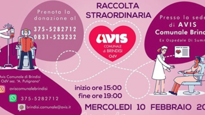 L’Avis Comunale di Brindisi promuove ed organizza un’altra raccolta sangue per mercoledì 10 febbraio, dalle ore 15 alle 19, presso la sede sita in piazza Di Summa presso l’ex ospedale, con l’ausilio dell’apposita autoemoteca della Asl.