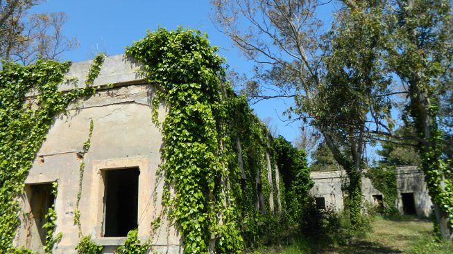 Fra i tanti caseggiati, ora diroccati, quelli che un tempo erano i vasti dormitori della Stazione Sanitaria Marittima, capaci di ospitare ognuno fino a 400 persone, privi di infissi ed in parte crollati, alcuni completamente avvolti da edera, resistono gruppi di alberi secolari, Pini e Querce, soprattutto, ma anche Eucalipti, mentre lungo il perimetro della proprietà, ben poche essenze arboree sono rimaste al loro posto.