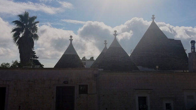 Il colore bianco delle costruzioni che spesso prendono forma di trullo, ti cambiano il punto di riferimento che si colloca in alto, in quel punto magico dell’incontro tra la punta del cono, una piccola sfera di pietra ed il cielo, quel luogo dove tutto è possibile e dove tutto s’incontra. Pare strano ma è lì che si concentra lo sguardo ed il punto posto in alto rappresenta l’alta significazione di traguardo e meta dell’attività lavorativa e certamente certosina del maestro costruttore.